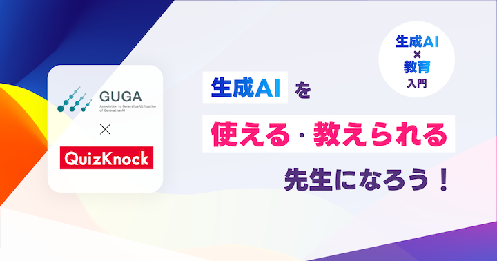 QuizKnockは、生成AIを社会に実装し、産業の再構築を目指す一般社団法人生成AI活用普及協会(GUGA)とコラボし、「【生成AI×教育入門】生成AIを使える、教えられる先生になろう!」を2024年3月17日(日)13:00〜15:30に開催します。